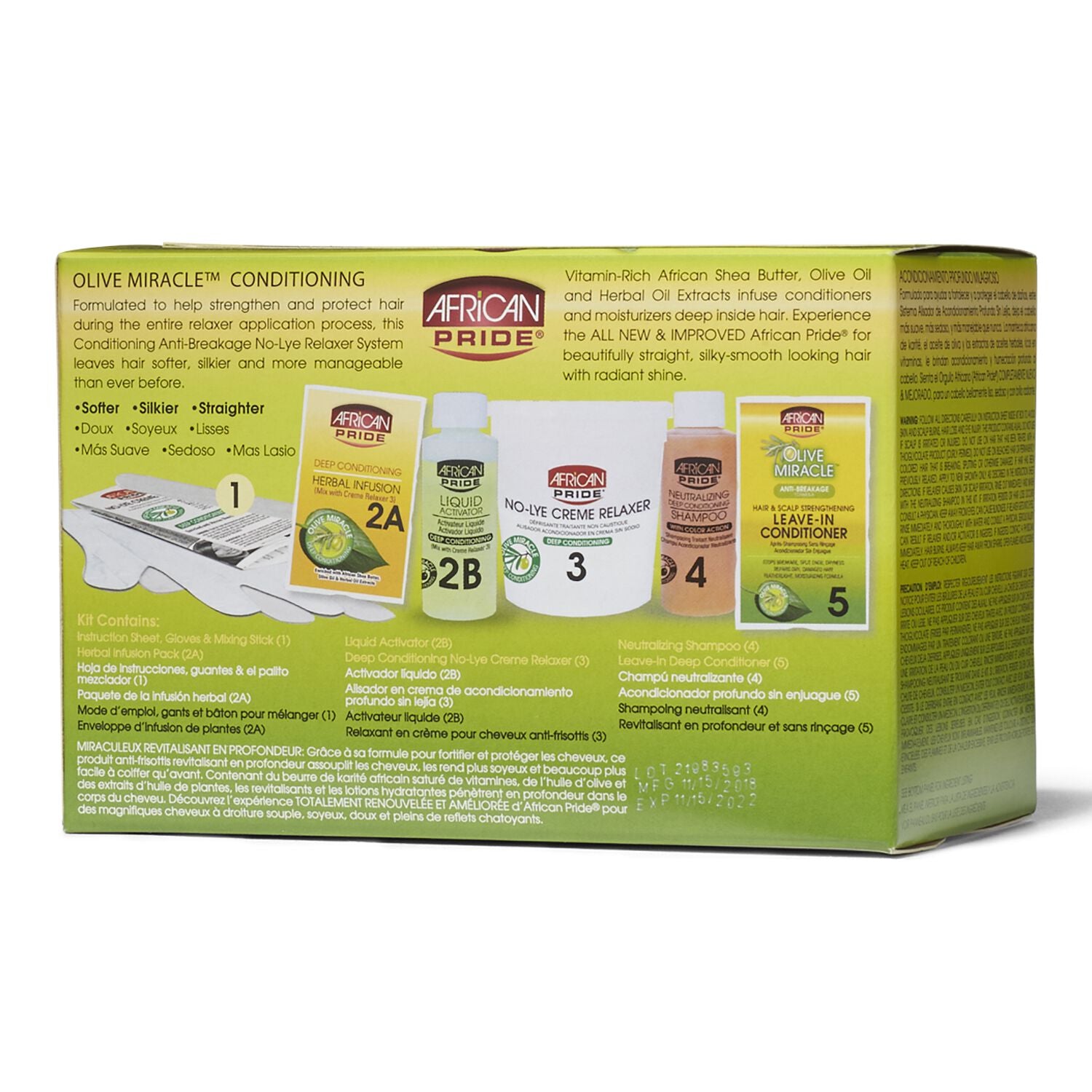 Dieses African Pride hair relaxer-Set, Teil der OLIVE MIRACLE®-Linie, wurde entwickelt, um natürliche Locken während des Glättungsprozesses zu stärken und zu schützen.