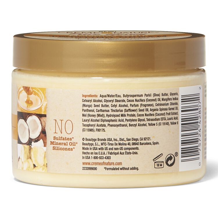 Aqua/Eau/Eau, Butyrospermum Parkii (Beurre de Karité), Glycérine, Alcool Cétéarylique, Glycéryl Stéarate, Huile de Cocos Nucifera (Noix de Coco), Beurre de Graine de Mangifera Indica (Mangue), Alcool Cétylique, Parfum, Chlorure de Cetrimonium, Panthénol, Huile de Graine de Carthamus Tinctorius (Carthame), Huile de Noyau d'Argania Spinosa, Miel, Protéine de Lait Hydrolysée, Extrait de Fruit de Cocos Nucifera (Noix de Coco), Acide Diphosphonique d'Alcool Laurique, Glycol Pentylène, Tetrasodium EDTA, Acide Laurique, Acétate de Tocophéryle, Phénoxyéthanol, Alcool Benzylique, Jaune 5 (CI 19140), Jaune 6 (CI 15985).
